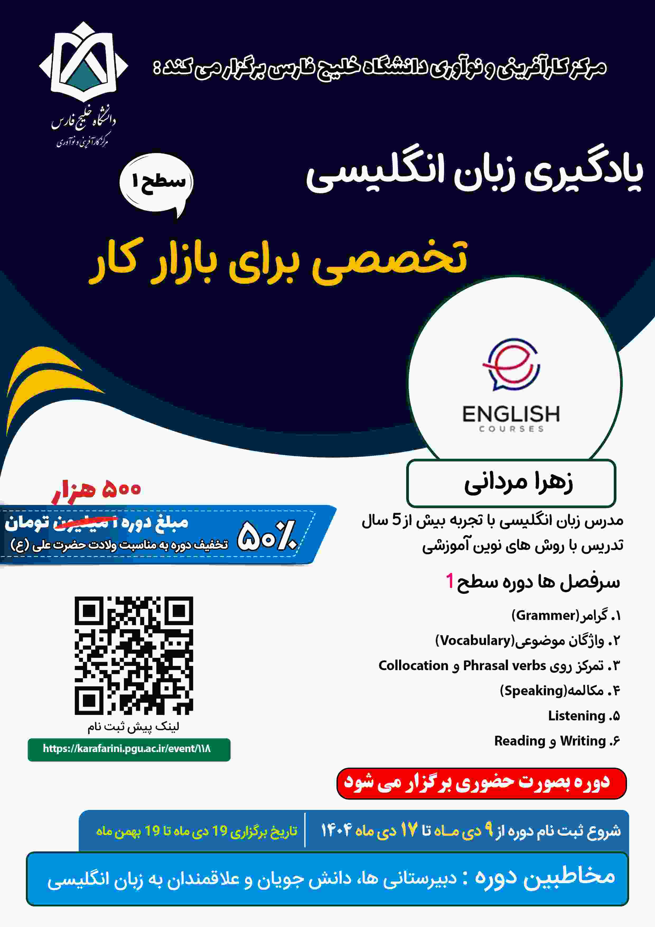 دورهی آموزش زبان انگلیسی سطح 1 با رویکرد تخصصی بازار کار ویژه دانشجویان، دبیرستانیها و علاقهمندان به یادگیری کاربردی زبان انگلیسی. این دوره بهصورت حضوری و با تمرکز بر مهارتهای موردنیاز محیطهای کاری و حرفهای برگزار میشود.