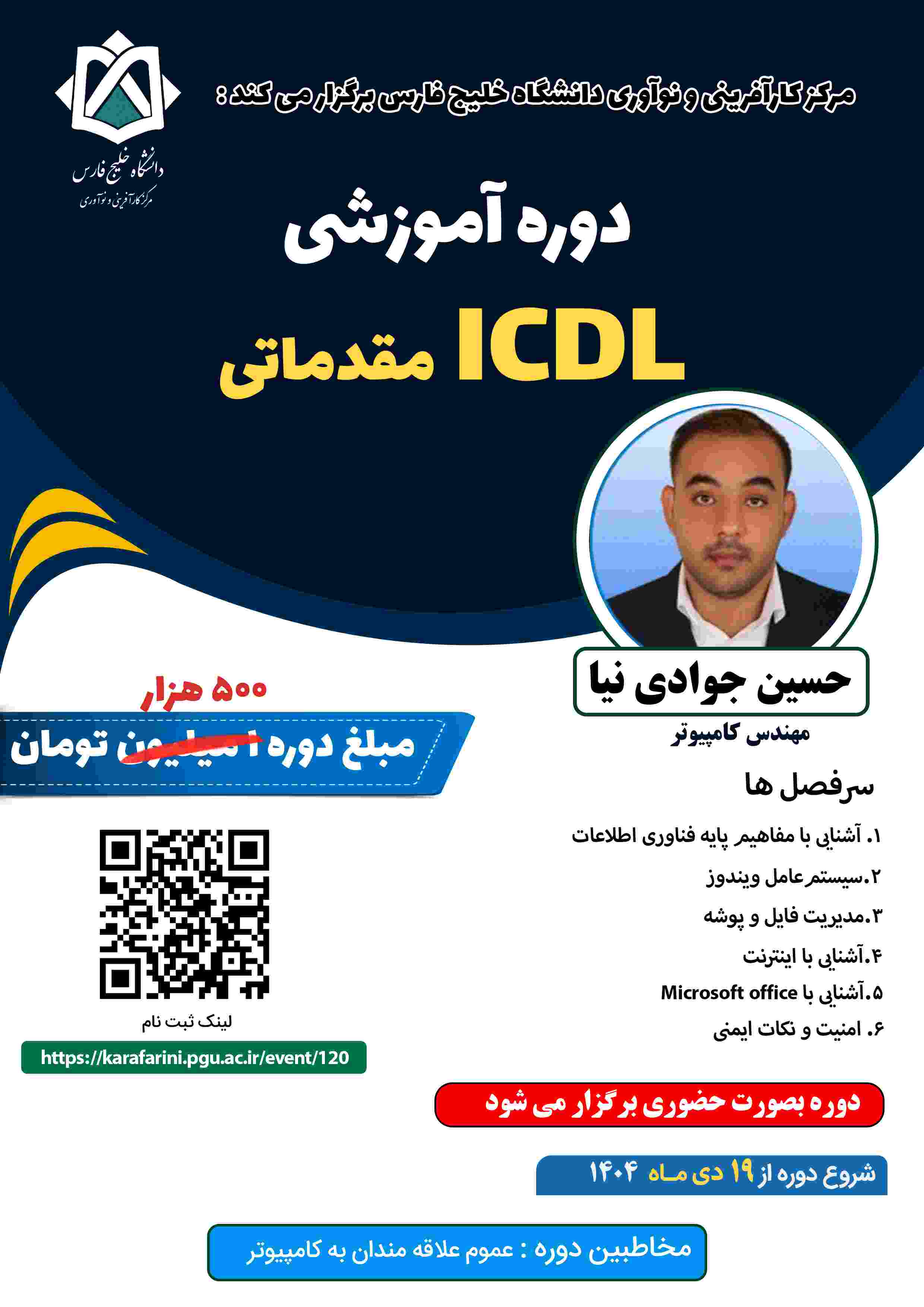 دوره آموزشی مقدماتی ICDL برای علاقهمندان به کامپیوتر، با هدف یادگیری مهارتهای اساسی و کاربردی در زمینه فناوری اطلاعات. این دوره بهصورت حضوری و توسط مهندس کامپیوتر حسین جوادینیا، ارائه میشود.