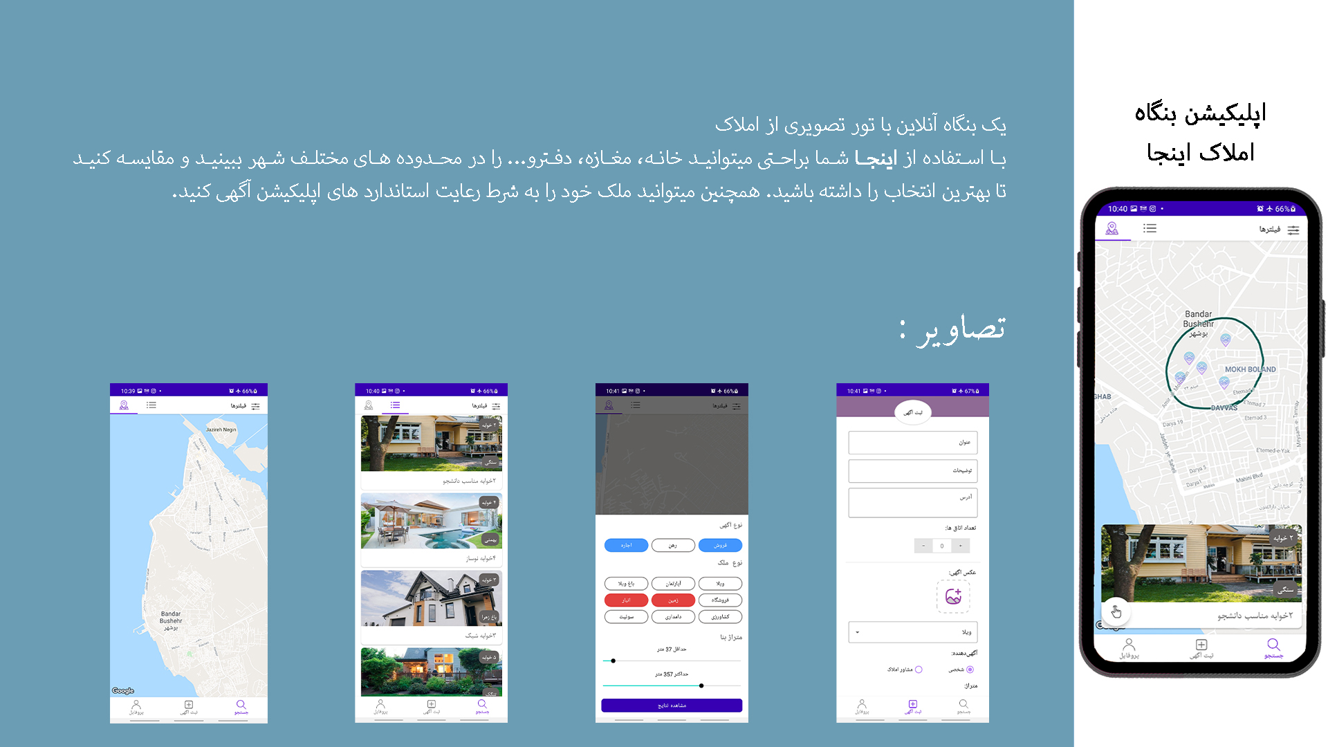 در این اپلیکیشن کاربر با ورود به اپلیکیشن میتواند آگهی های فروش اجاره یا رهن ملک های ثبت شده در نقشه را مشاهده کند و قابلیت خاصی که این برنامه نسبت به دیوار و سایر برنامه های مشابه دارد این است که کاربر می تواند با مشخص کردن یک محدوده مشخص آگهی های درون آن محدوده را مشاهده کند.
